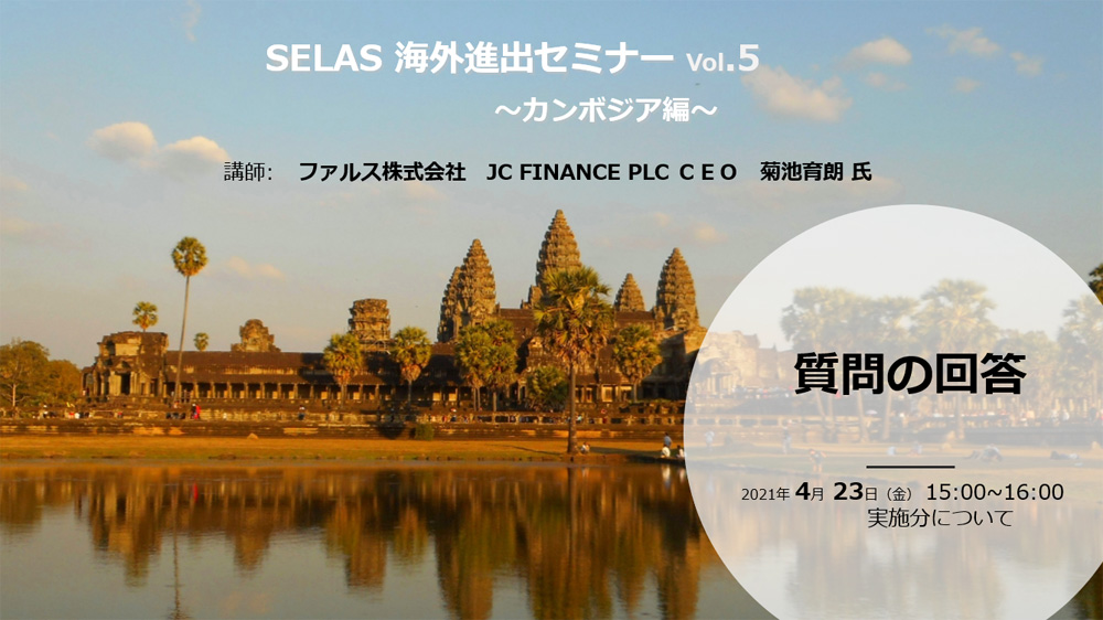 2021年4月23日(金)に開催いたしました、SELAS海外進出セミナーVol.5~カンボジア編~にてセミナー中に視聴者の皆さまから頂きましたご質問の回答を掲載させて頂きます。 アーカイブ動画はこちら> Q […]